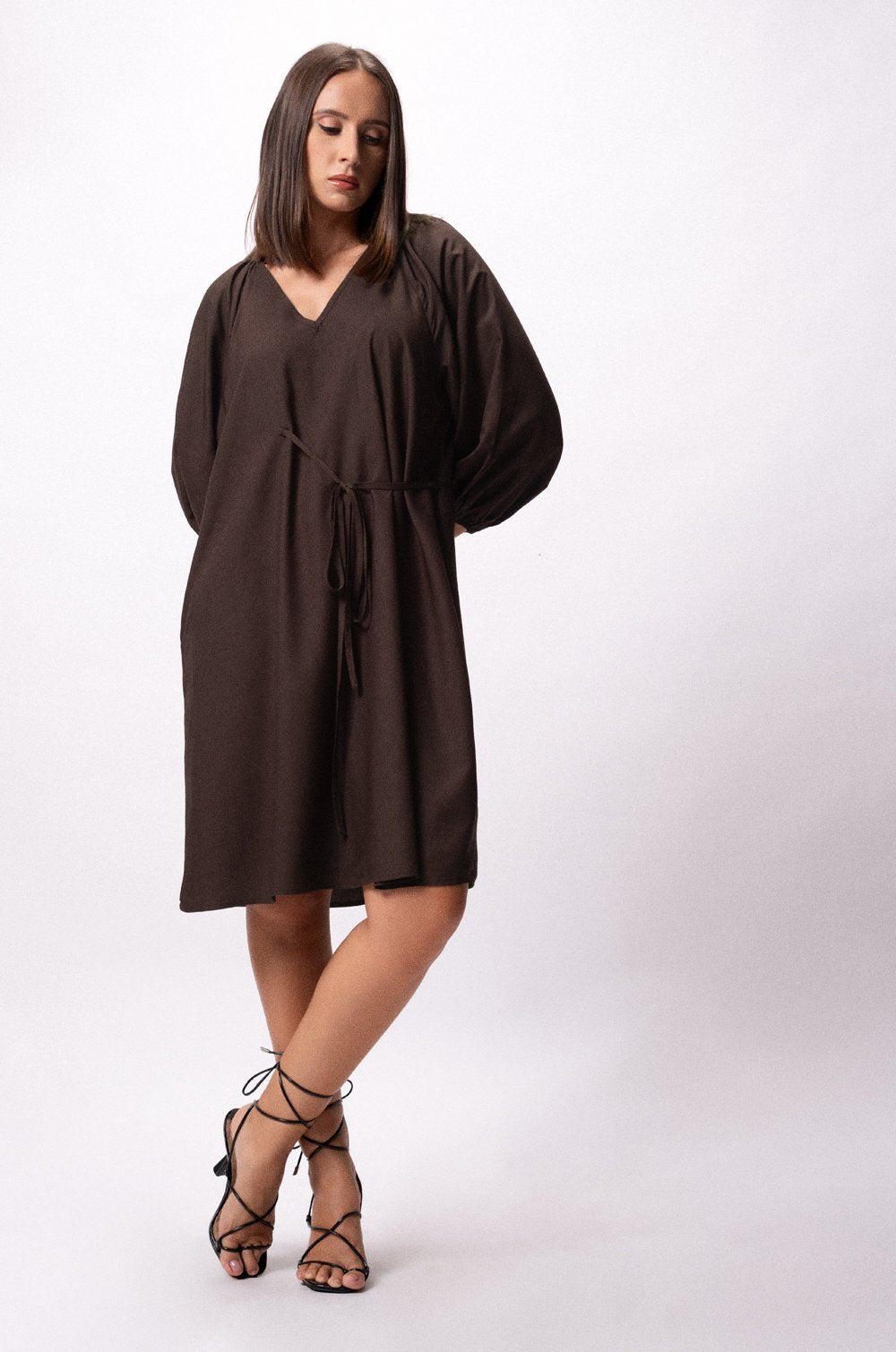 BALLOON SLEEVE SHIFT DRESS - COFFEE BROWN