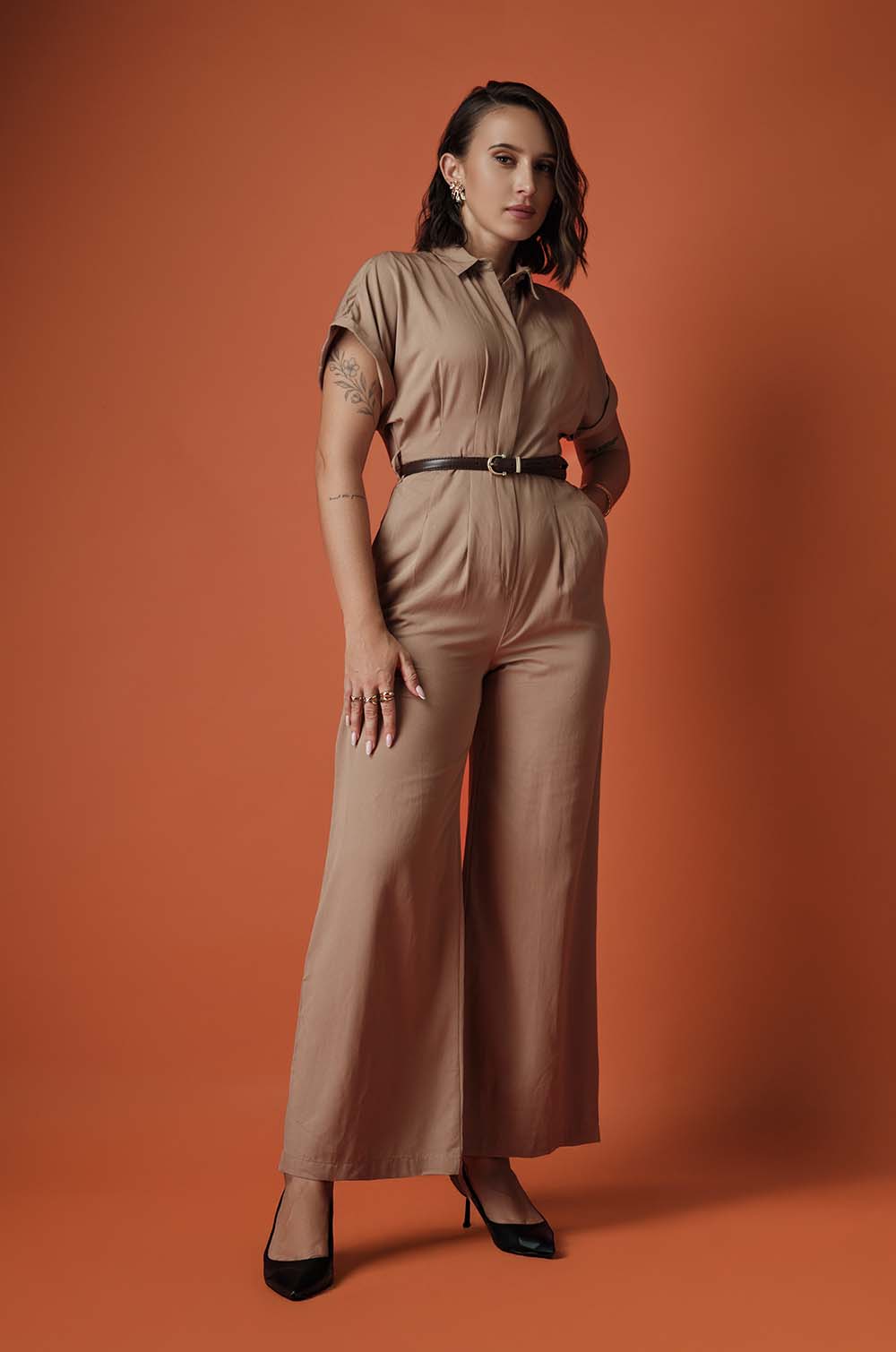 CINCHED WAIST JUMPSUIT - BEIGE