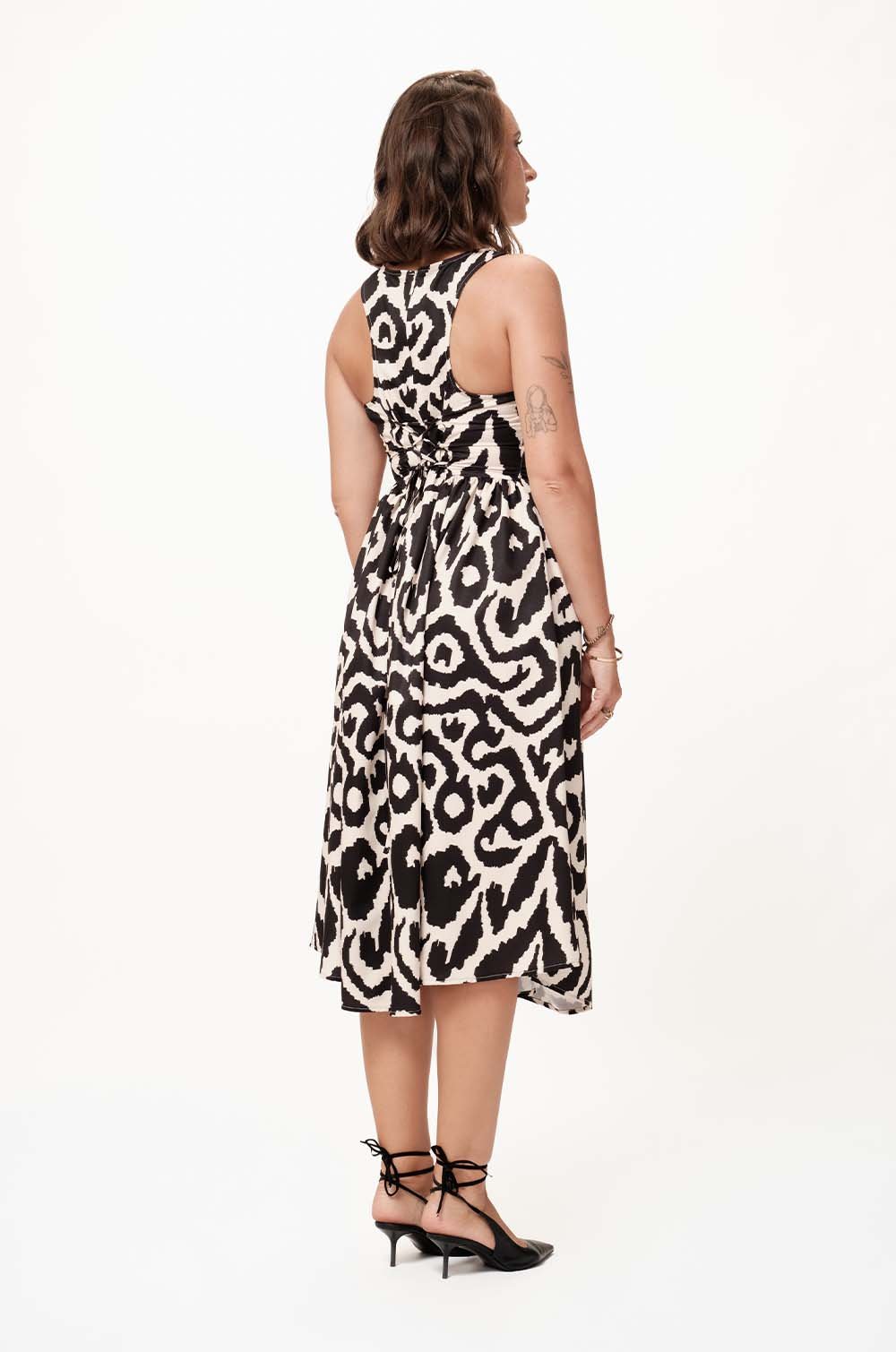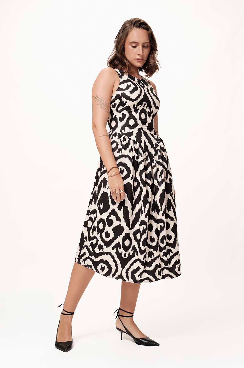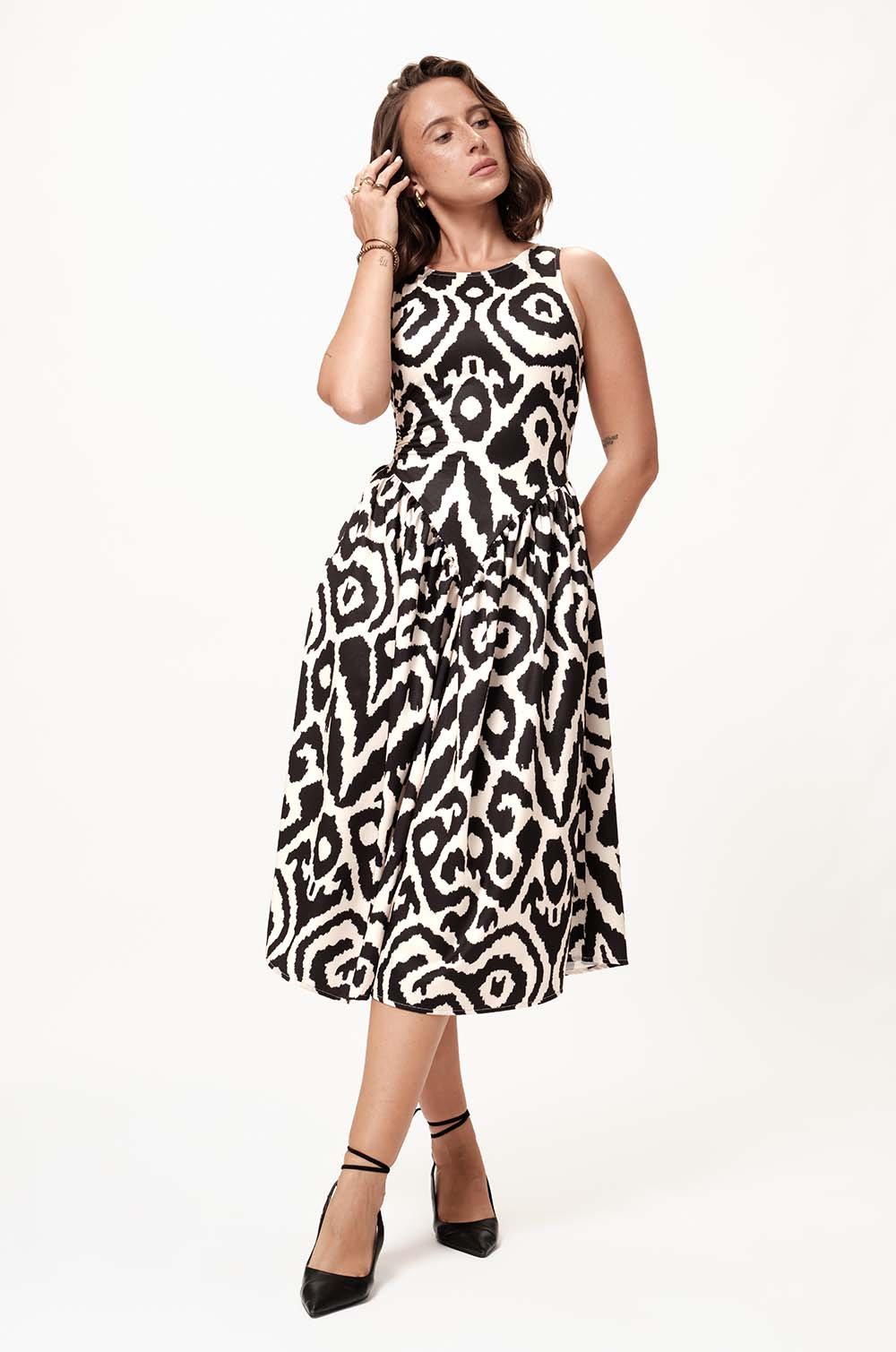 CINCHED WAIST PRINTED MIDI DRESS - BLACK