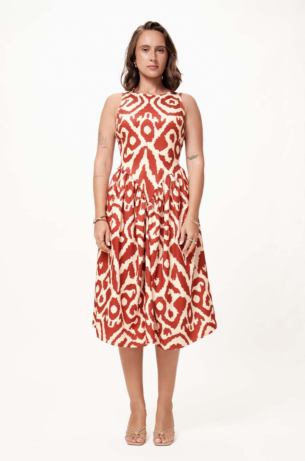 CINCHED WAIST PRINTED MIDI DRESS - RED