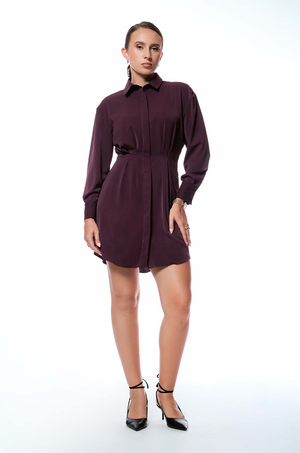 CINCHED WAIST SHIRT DRESS - BURGANDY