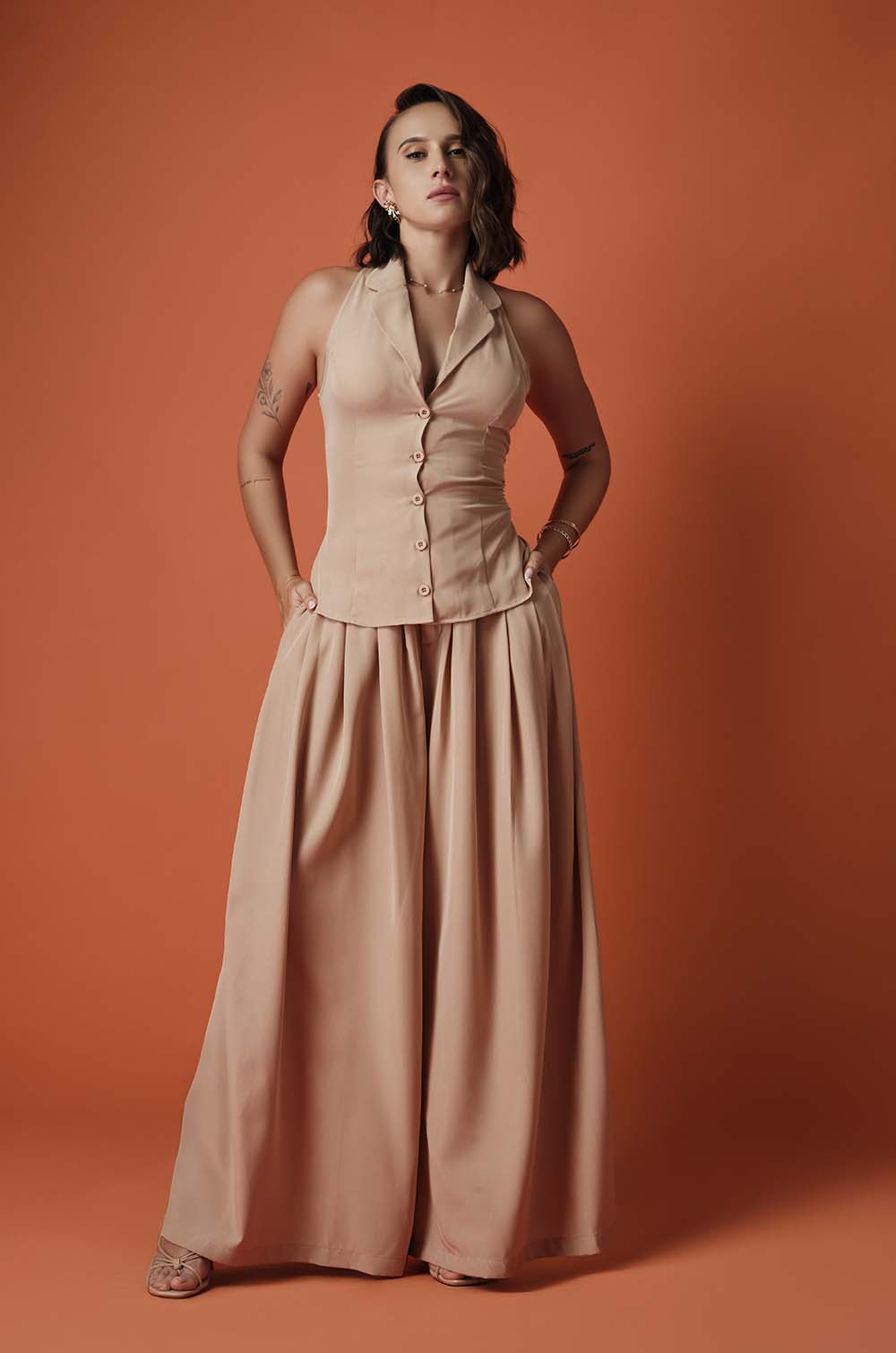 CINCHED WAIST SLEEVELESS TOP - BEIGE