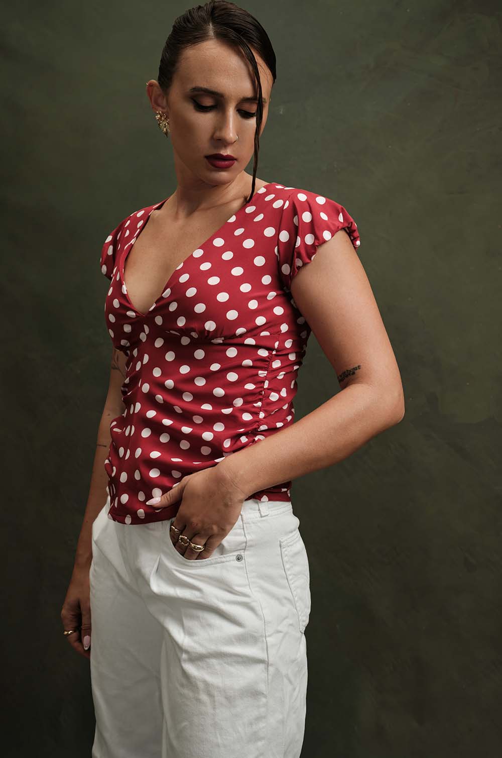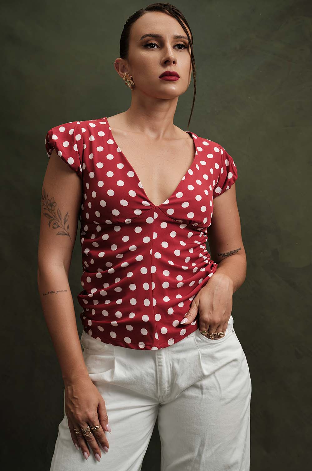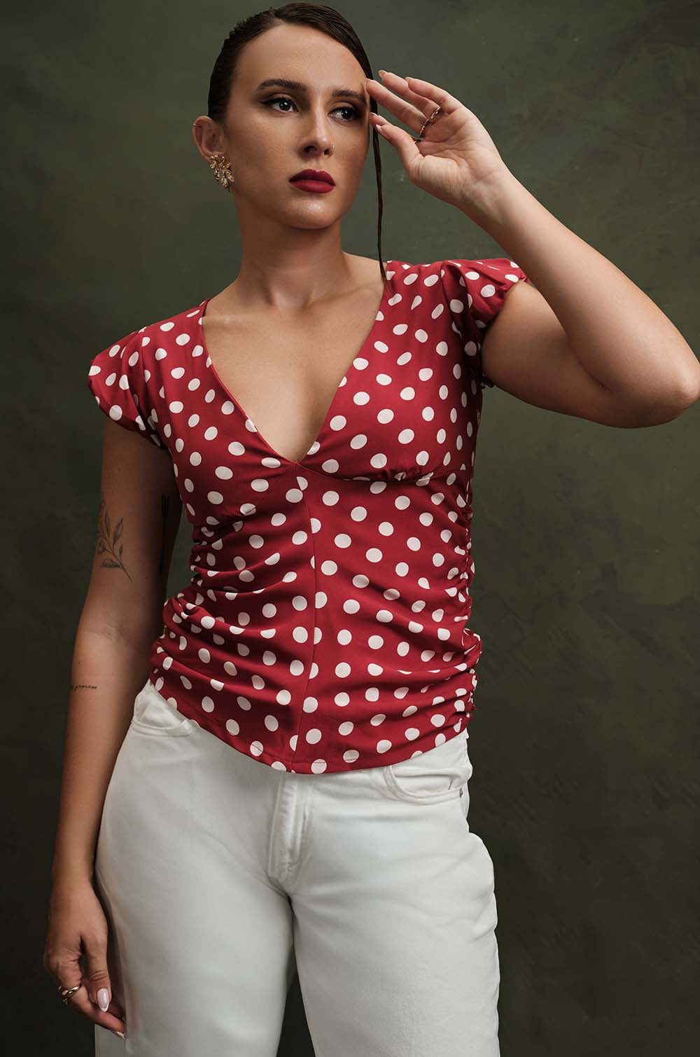PUFF SLEEVE PLUNGE NECK TOP - RED