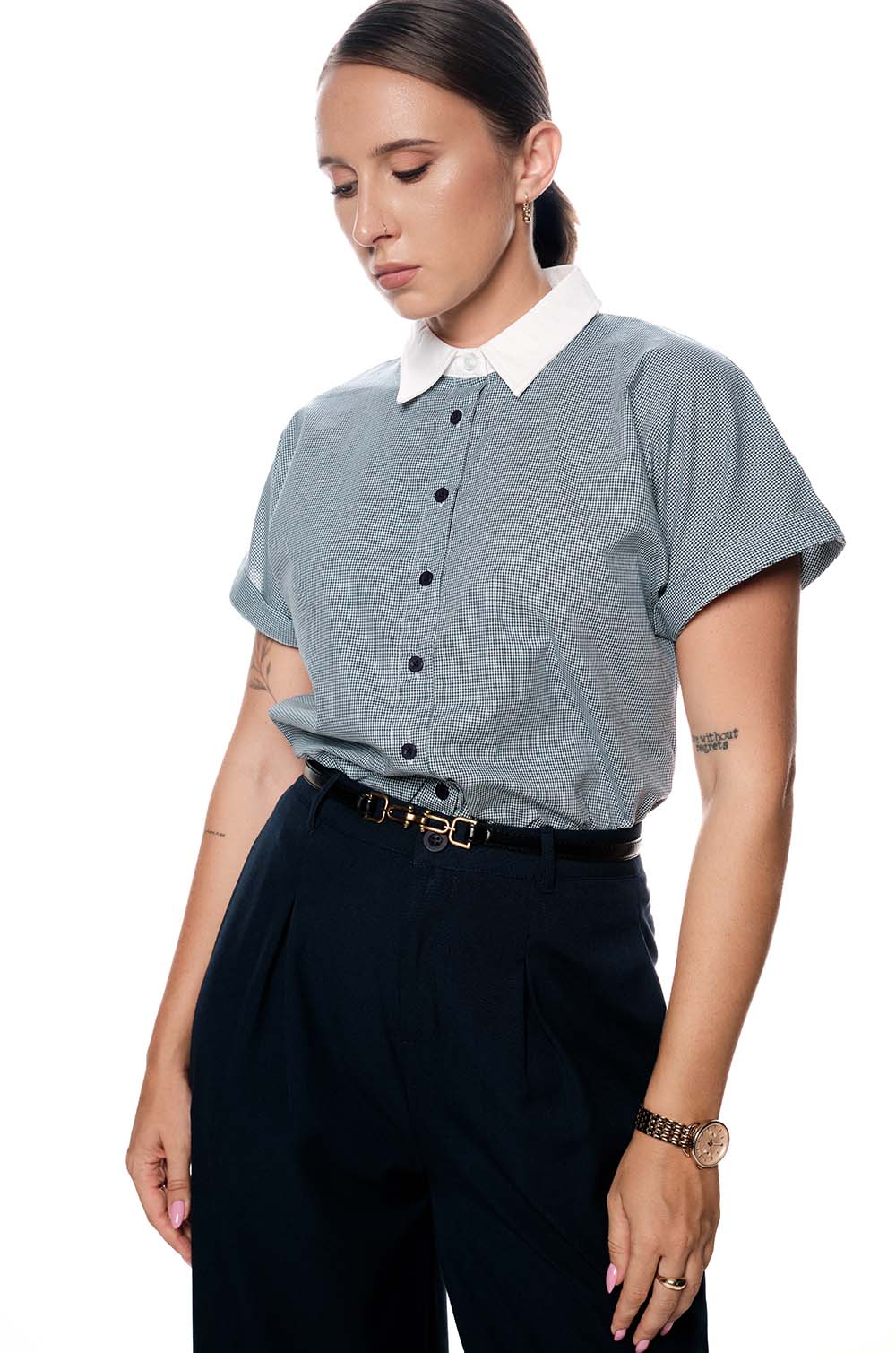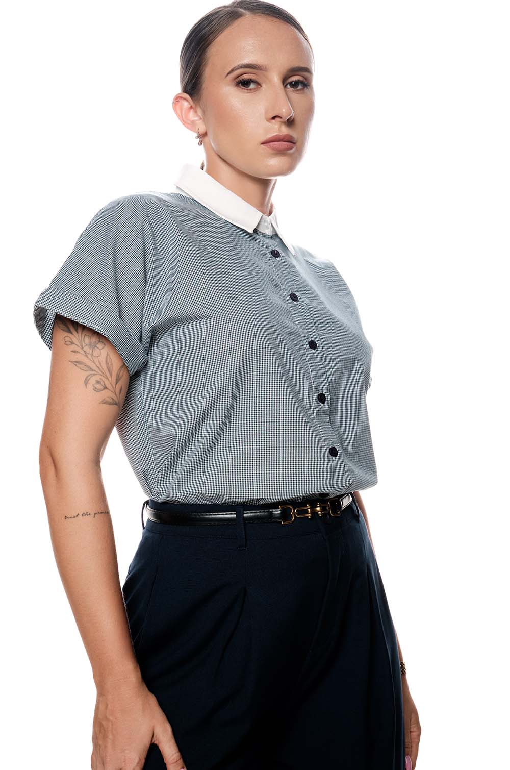 CONTRAST COLLAR TINY CHECKED TOP - BLUE