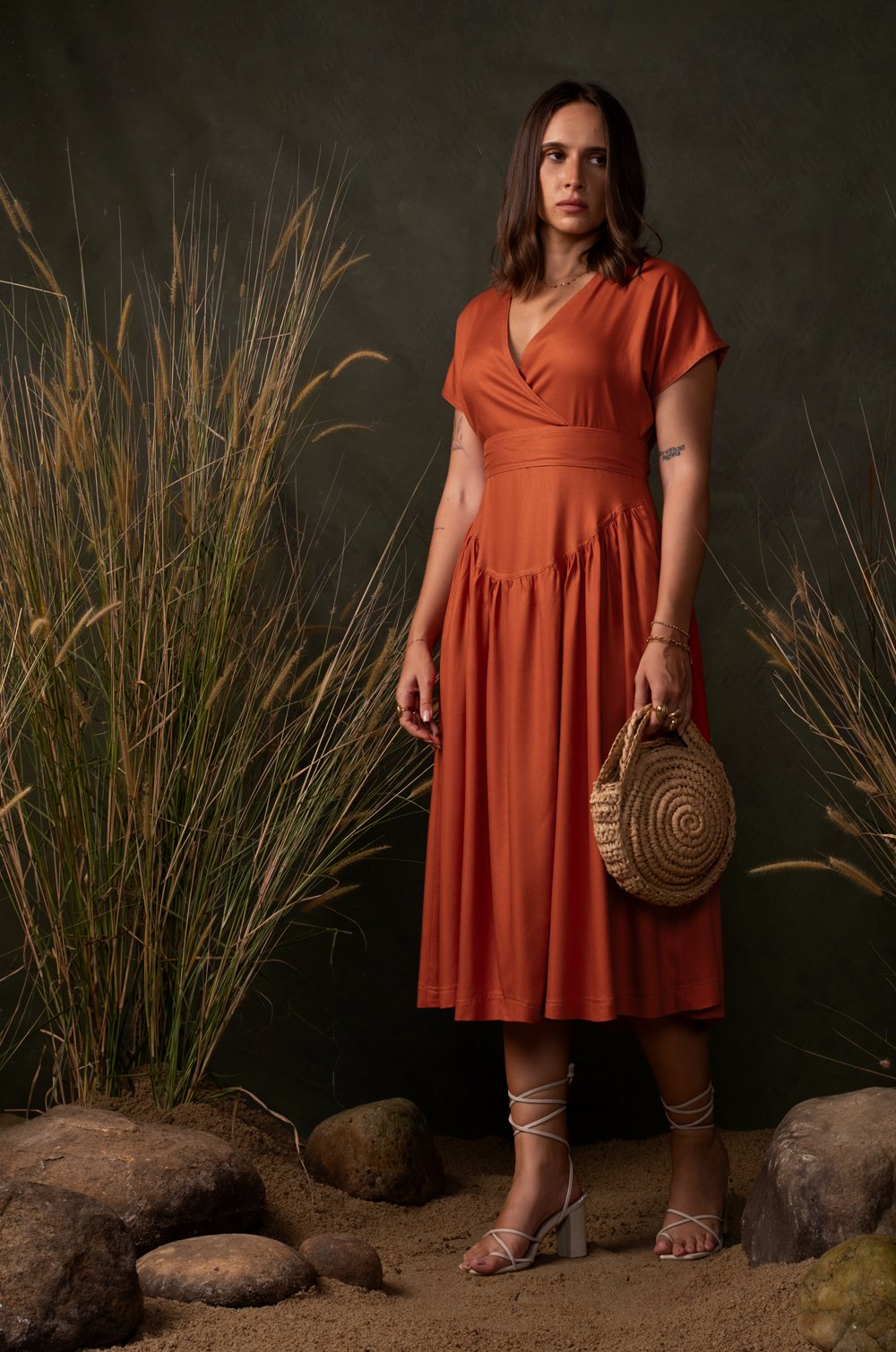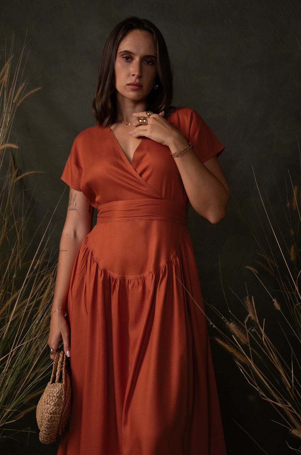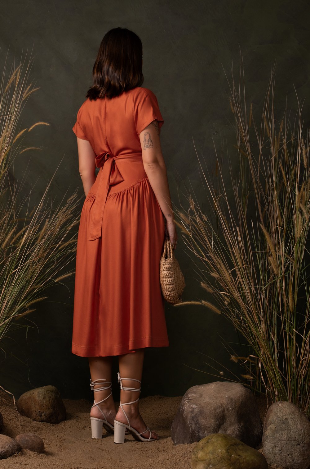 CONTRAST STITCHED MIDI DRESS - ORANGE