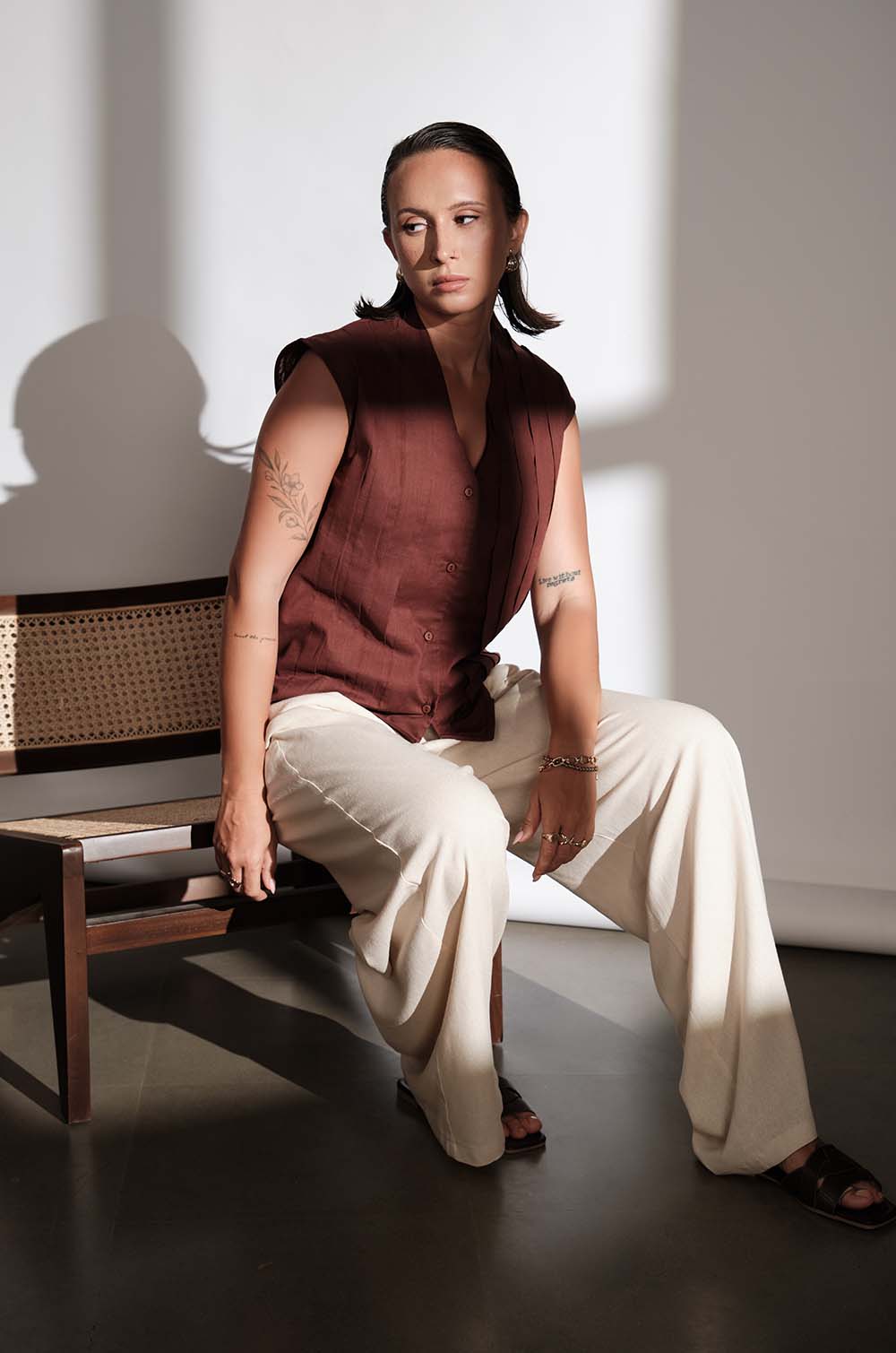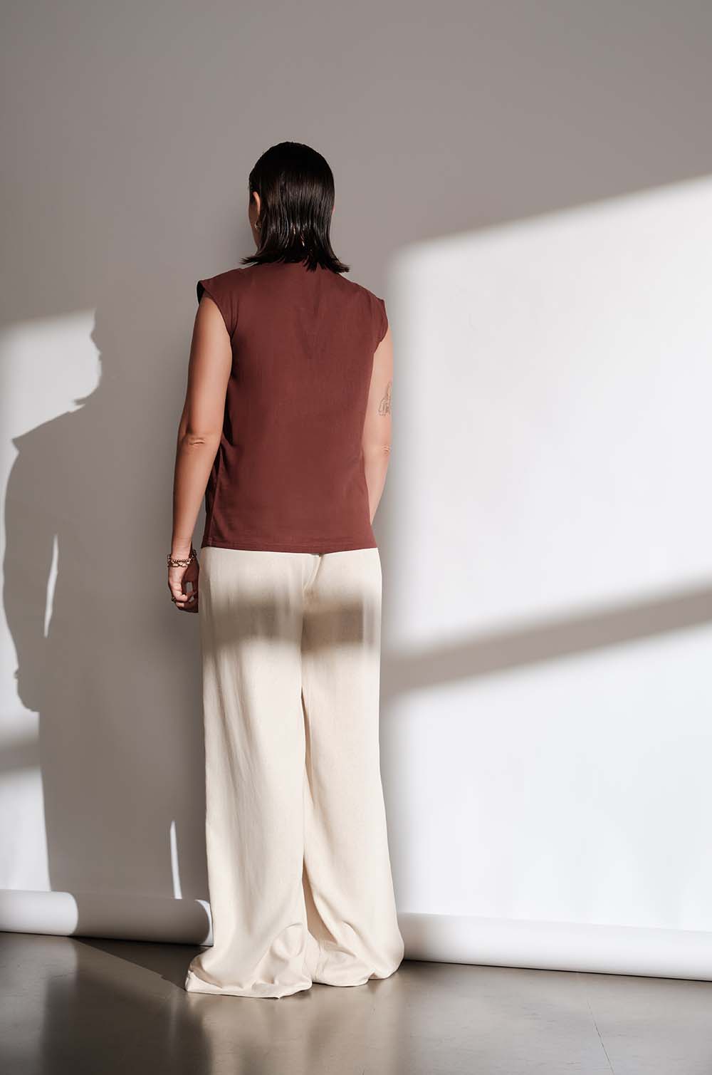 PLEAT DETAILED V NECK TOP - BROWN