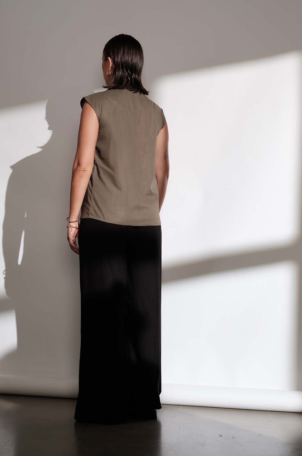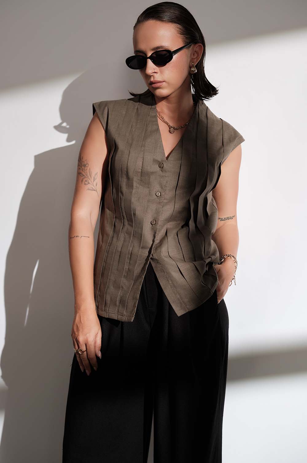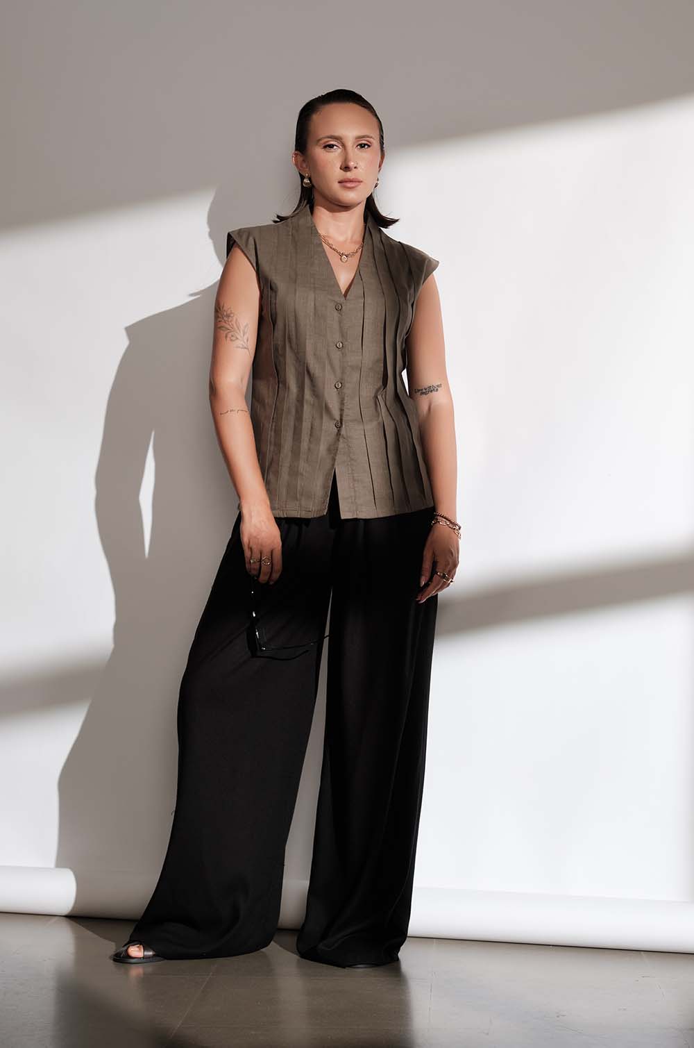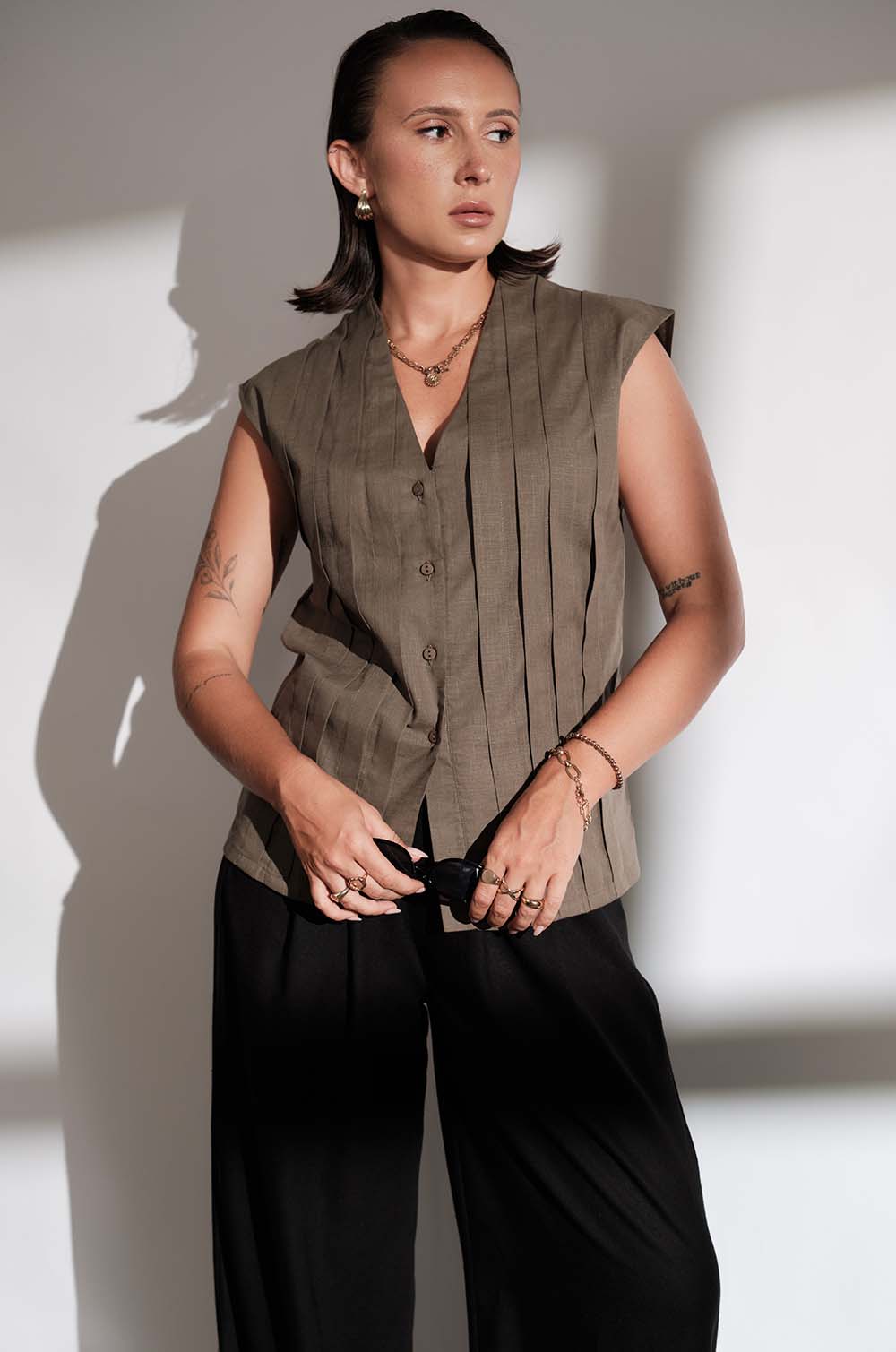 PLEAT DETAILED V NECK TOP - OLIVE