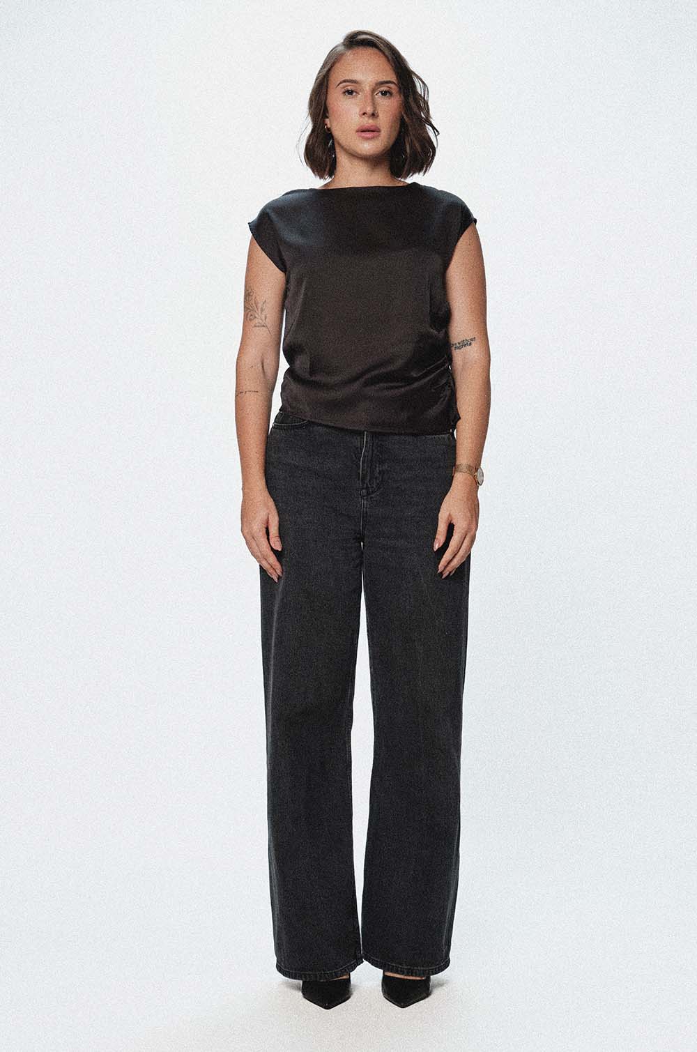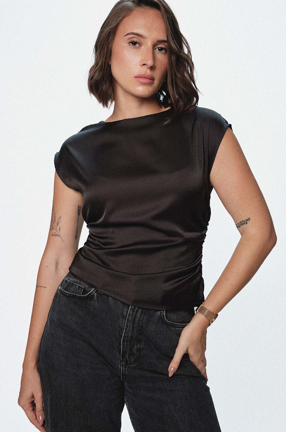 SEAM GATHERED SATIN BLOUSE - BLACK